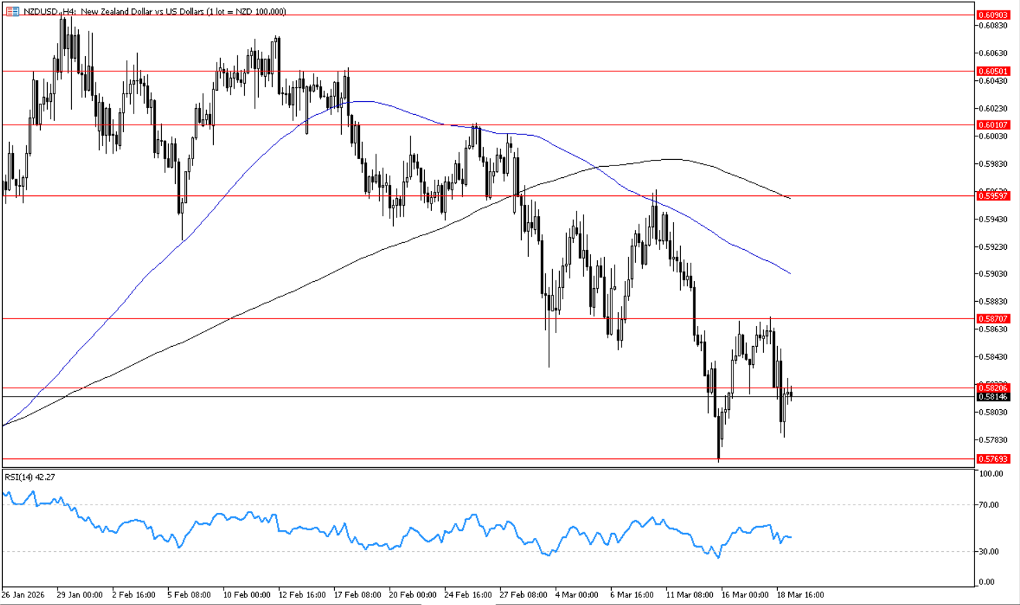 يتحرك الزوج في اتجاه هابط على اطار الأربع ساعات. وارتد لاسفل حول مستوى 0.5820 الذي يمثل مستوى مقاومه افقي على اطار الاربع ساعات, وبالارتداد منه لاسفل يدعم استمرار الاتجاه الهابط واستهداف مستوى 0.5770 ثم 0.5715. ويظهر مؤشر القوة النسبية احتمالات استمرار الاتجاه الهابط بتحركه بين مستوي 50 و 30.