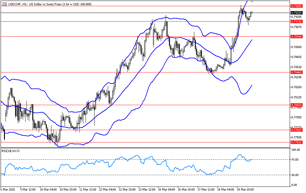 يتحرك الزوج في اتجاه هابط على إطار الاربع ساعات, وارتد لاسفل حول مستوى 1.8935 الذي يمثل مستوى مقاومه افقي على اطار الاربع ساعات, ما يدعم استمرار الاتجاه الهابط واستهداف مستوى 1.8710 ثم 1.8590. ويظهر مؤشر القوة النسبية احتمالات استمرار الاتجاه الهابط بتحركه حول مستوى 50.